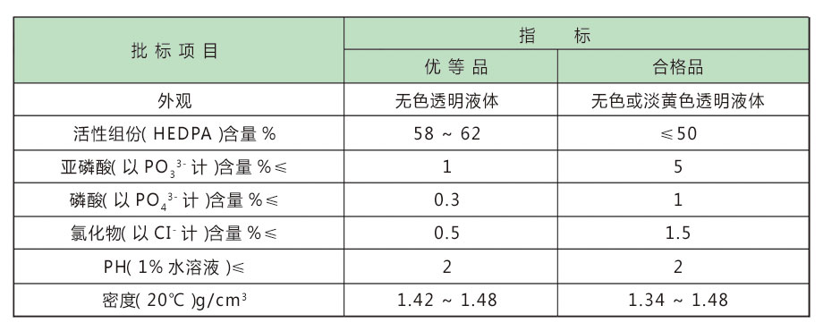 本品為無色或淡黃色透明液體,化學(xué)性能穩(wěn)定,在200℃下有良好的緩蝕阻垢作用,抗氯性好,低毒無公害。能與多種金屬離子形成穩(wěn)定的絡(luò)合物。